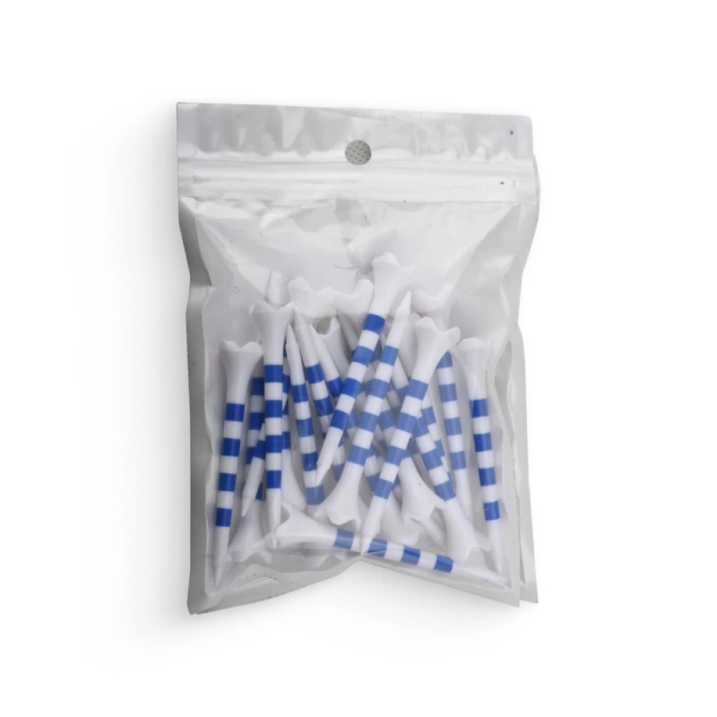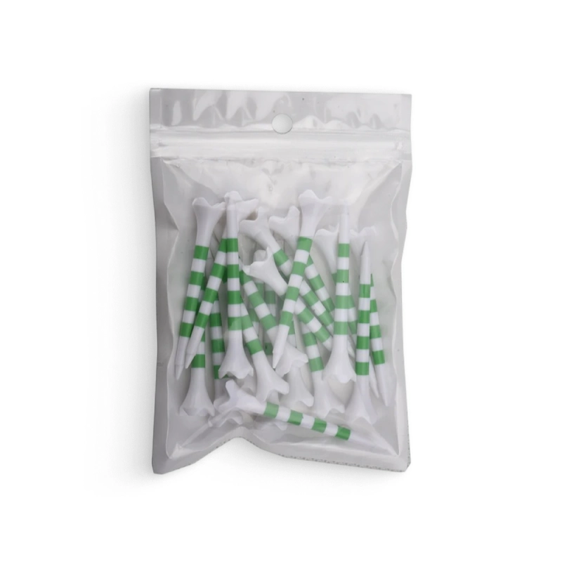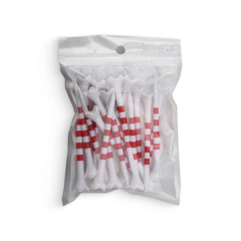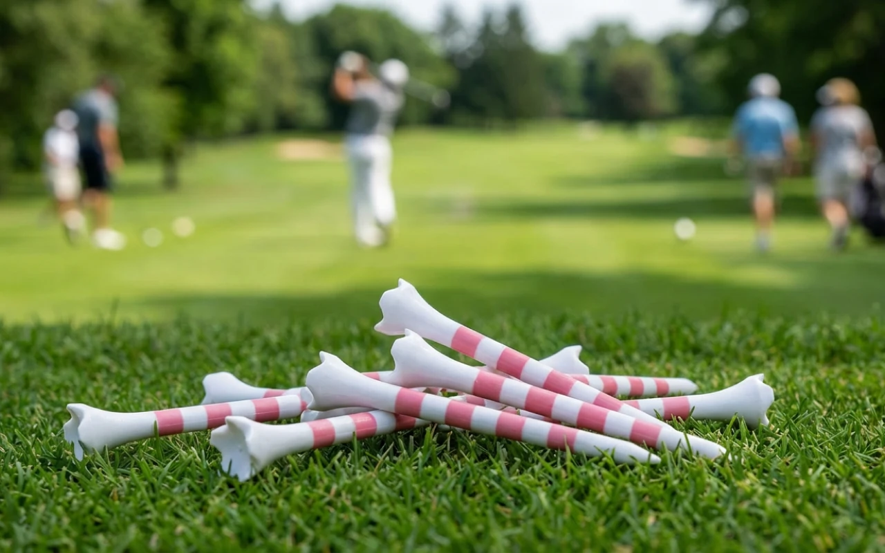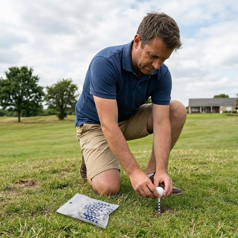 Folosesc același mic pumn de tee-uri de câteva săptămâni. Rezistă bine diminețile umede, intră ușor în solul tare, iar inelele colorate îmi fac așezarea mingii simplă și repetabilă.