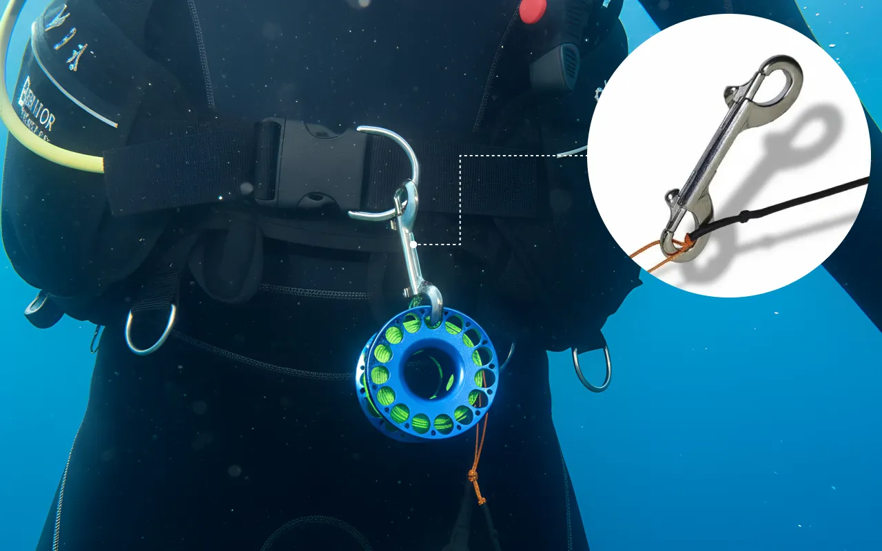 Carabiniera din oțel inoxidabil se prinde rapid de inelul D. Fără bătăi de cap, astfel încât să te concentrezi pe aventura ta subacvatică.