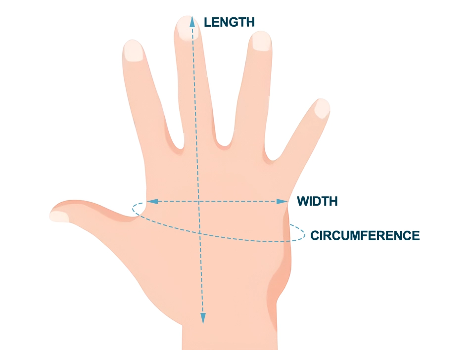 | SIZE | HAND LENGTH | HAND WIDTH | PALM CIRCUMFERENCE | |||
