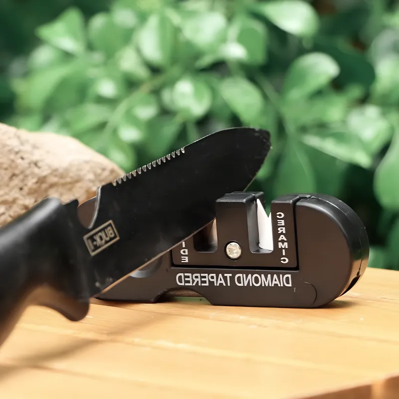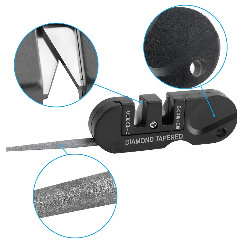 Ascuțitorul Threo 4-în-1 menține lamele pregătite pentru acțiune în doar câteva secunde. Pune-l în buzunar, în geantă sau agăță-l la chei pentru acces rapid. Bucură-te de tăieturi precise și fine fie că gătești, faci drumeții sau campezi.