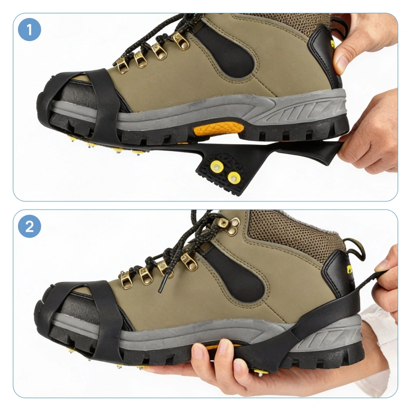 Nu ai nevoie de unelte sau curele, instalarea durează câteva secunde. Îndepărtezi crampoanele la fel de ușor pentru a păstra încălțămintea curată.