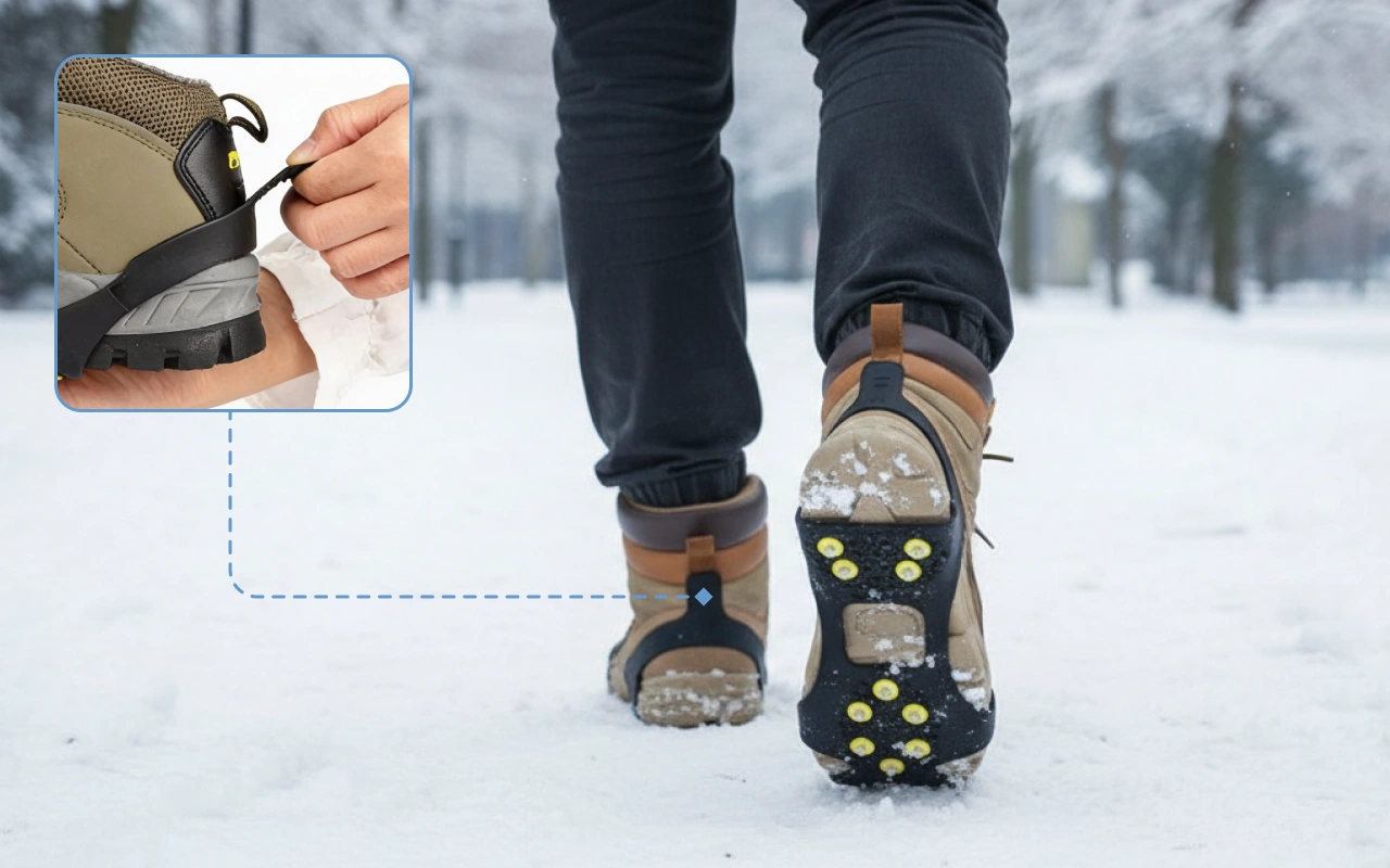 Nu ai nevoie de unelte sau curele, instalarea durează câteva secunde. Îndepărtezi crampoanele la fel de ușor pentru a păstra încălțămintea curată.