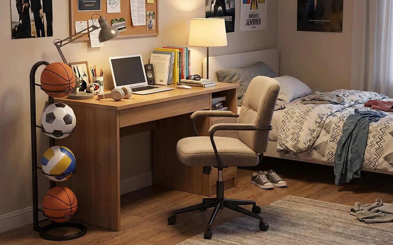 Îmi place cât de suplu este acest suport. Încape lângă canapea, păstrează mingea noastră de baschet la îndemână pentru jocurile de seară și se potrivește frumos cu încăperea.