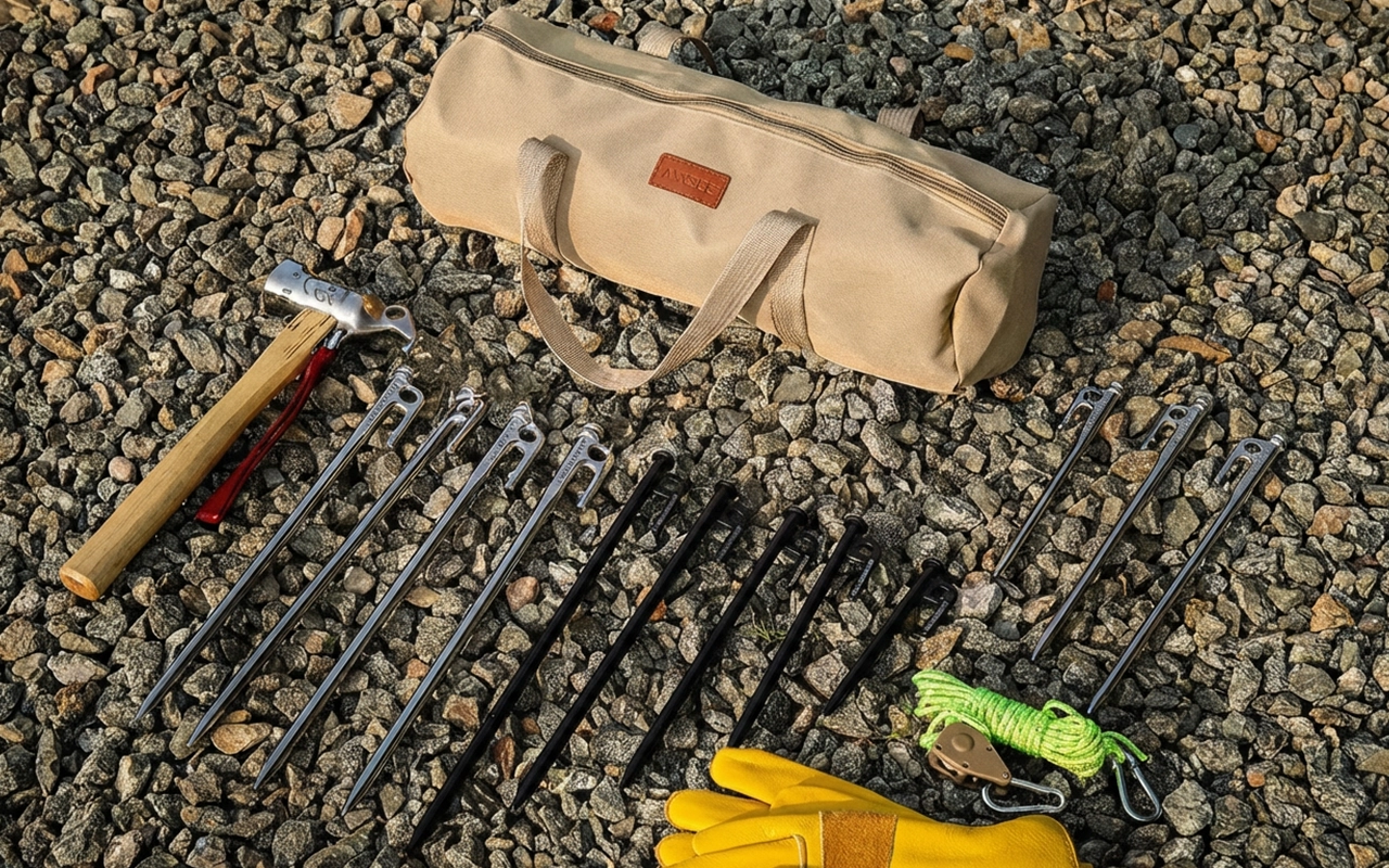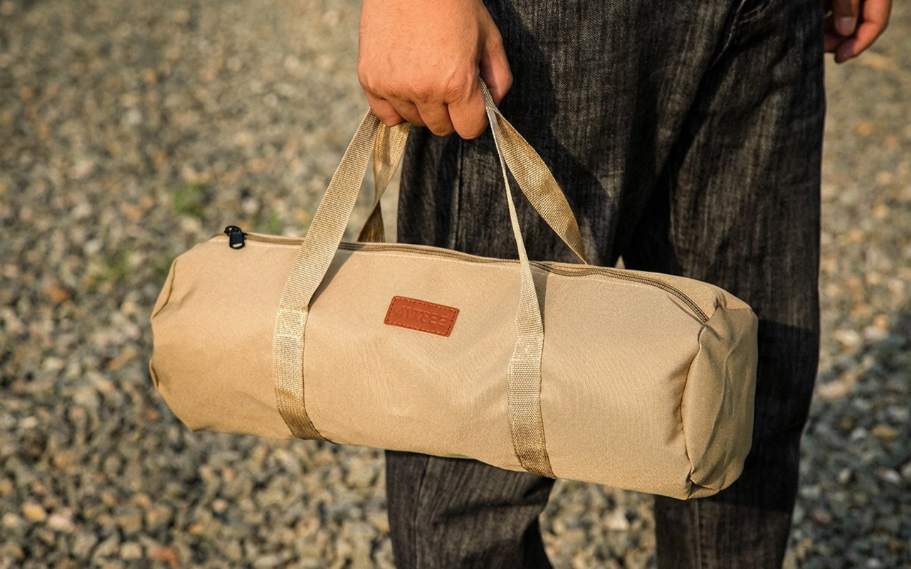 Îl țin în autorulotă cu țăruși de rezervă și un ciocan pliabil. Materialul pare rezistent, iar mânerele sunt comode chiar și când este plin.