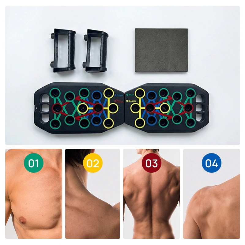 Pozițiile colorate ghidează mâinile pentru a lucra zone musculare specifice. Bucură-te de forță echilibrată în piept, brațe, umeri și spate.