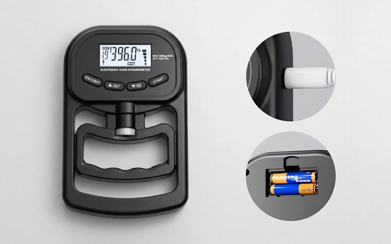 Alege între încărcare prin USB sau baterii clasice, după nevoie. Continuă să folosești dinamometrul de prindere Threo fără grija că rămâi fără energie.
