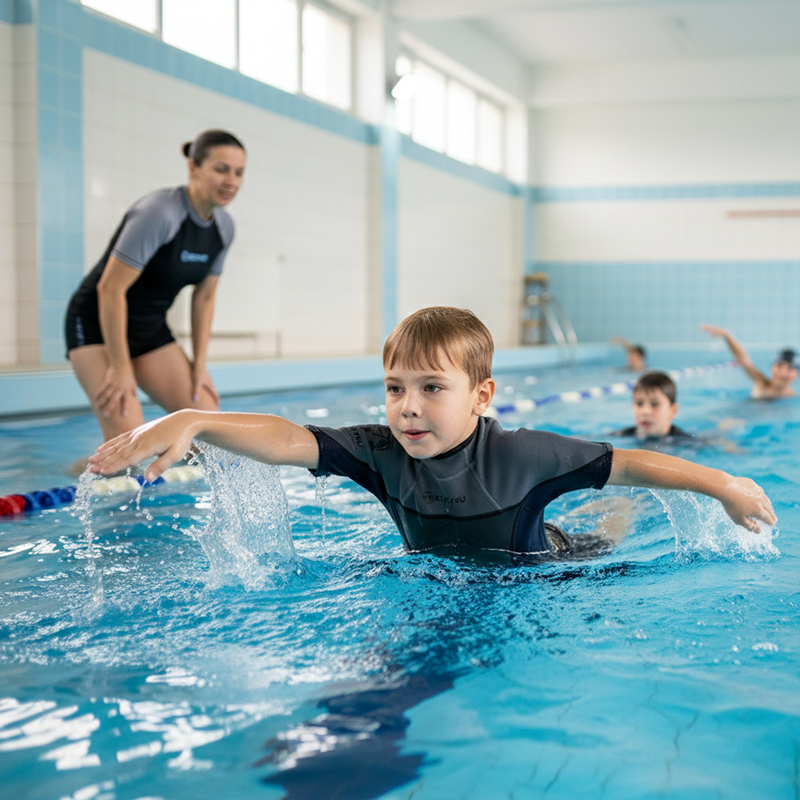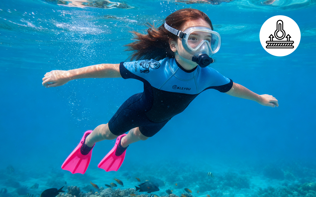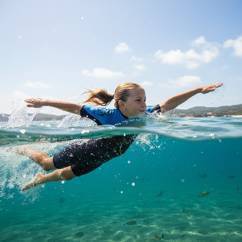 Fiecare stropire este mai plăcută când copiii nu se răcesc rapid. Costumul Threo folosește neopren moale și elastic care îmbrățișează ușor fiecare formă. Mânecuțele scurte permit brațelor să se miște ușor în apă, făcând înotul distractiv.