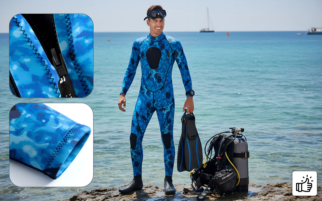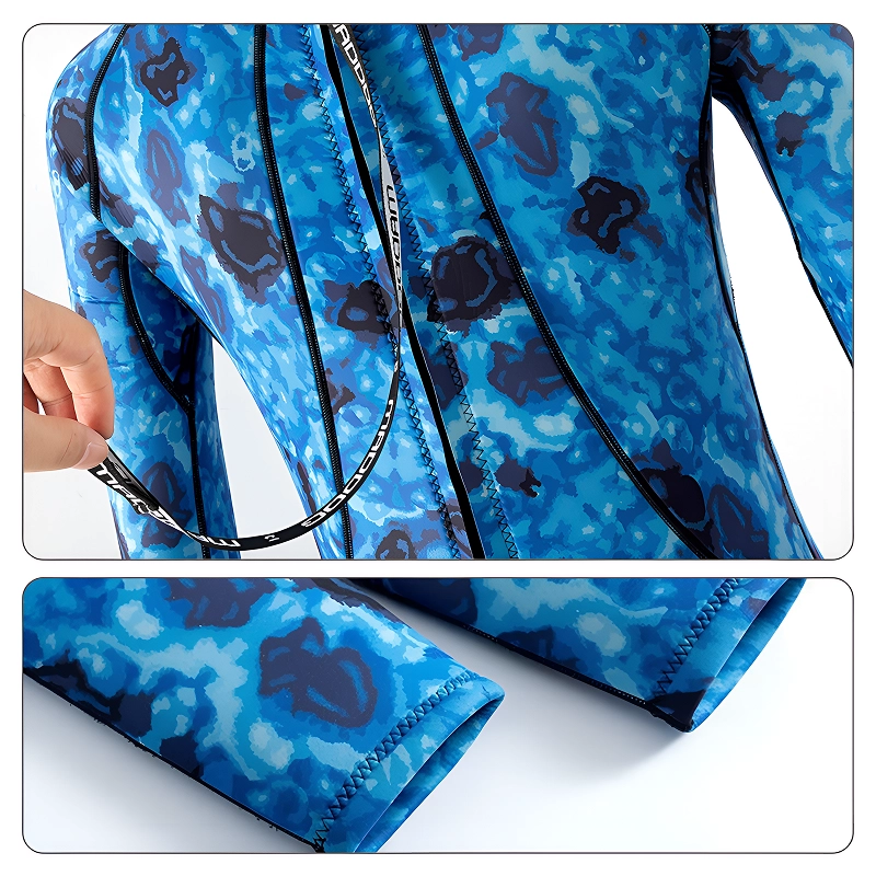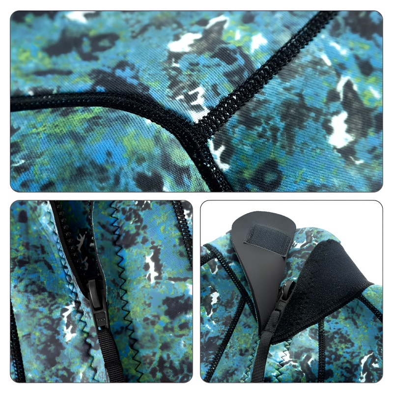 Designul camuflaj te ascunde de creaturile marine și pericole. Construcția durabilă protejează pielea de înțepături, zgârieturi și obiecte ascuțite.