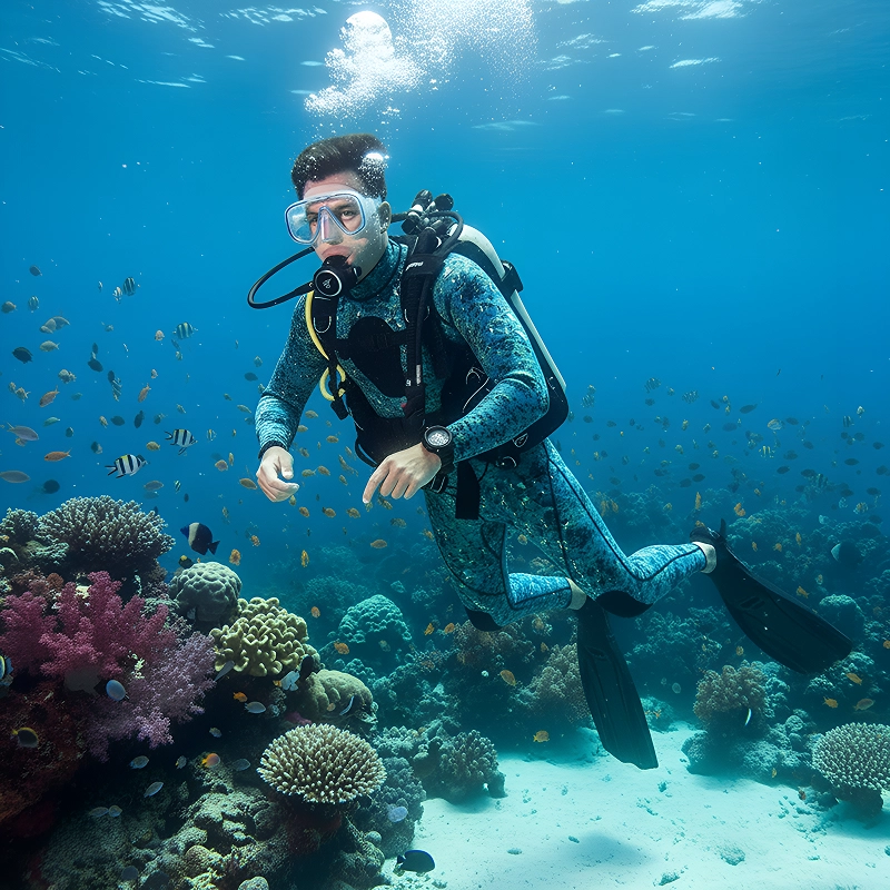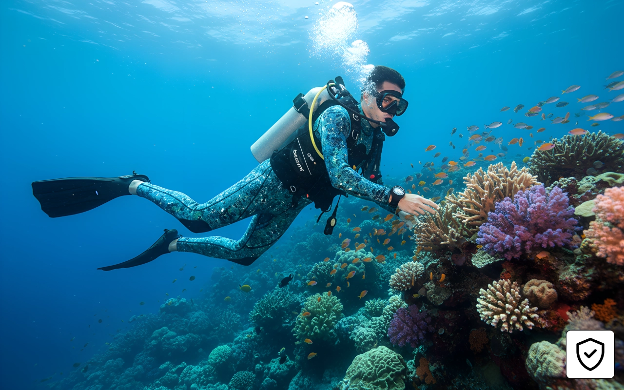 Neoprenul de trei milimetri îți menține constantă căldura corpului. Apa rece nu îți va opri experiența subacvatică.