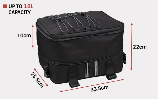 Această geantă montată pe portbagaj oferă suficient spațiu pentru tot echipamentul și obiectele personale. Poate fi extinsă până la 18L, permițându-ți să iei tot ce ai nevoie. Este perfectă pentru excursii de weekend sau naveta zilnică.