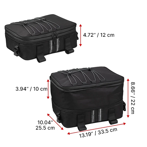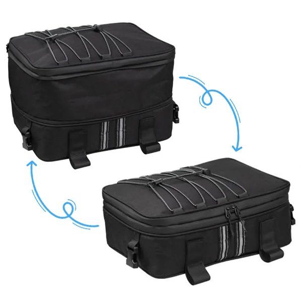 Această geantă montată pe portbagaj oferă suficient spațiu pentru tot echipamentul și obiectele personale. Poate fi extinsă până la 18L, permițându-ți să iei tot ce ai nevoie. Este perfectă pentru excursii de weekend sau naveta zilnică.