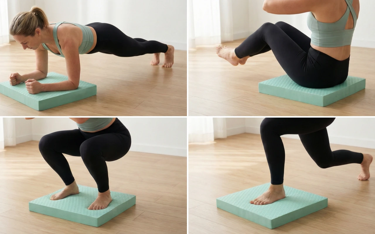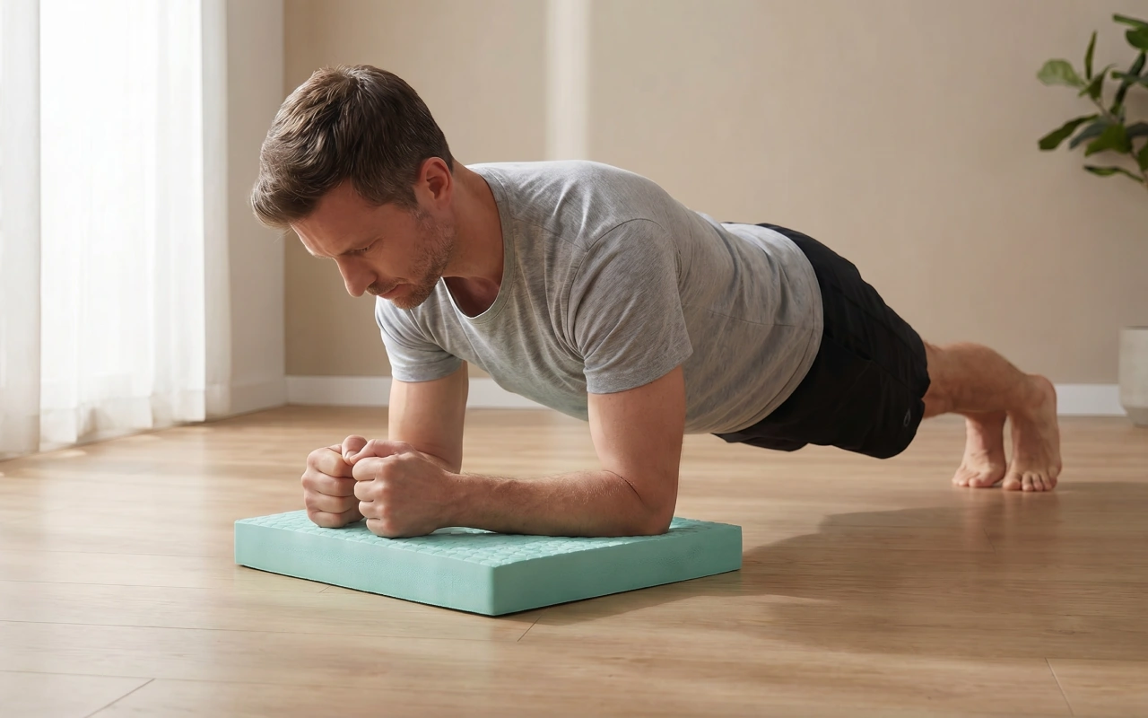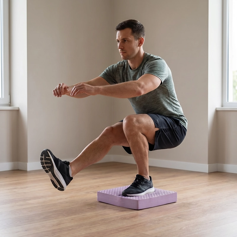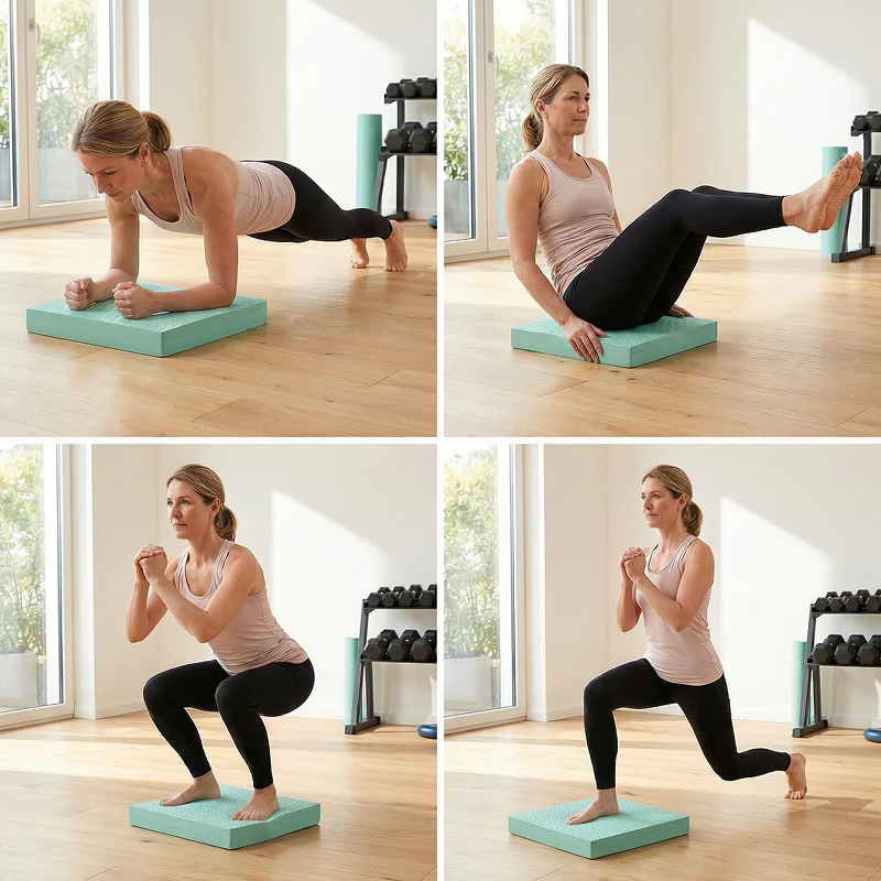 Sunt în jur de cincizeci de ani și această saltea chiar mă ajută la exercițiile de echilibru. Simt zona core mai activată, dar pernuțarea îmi menține genunchii fericiți pe podelele tari.