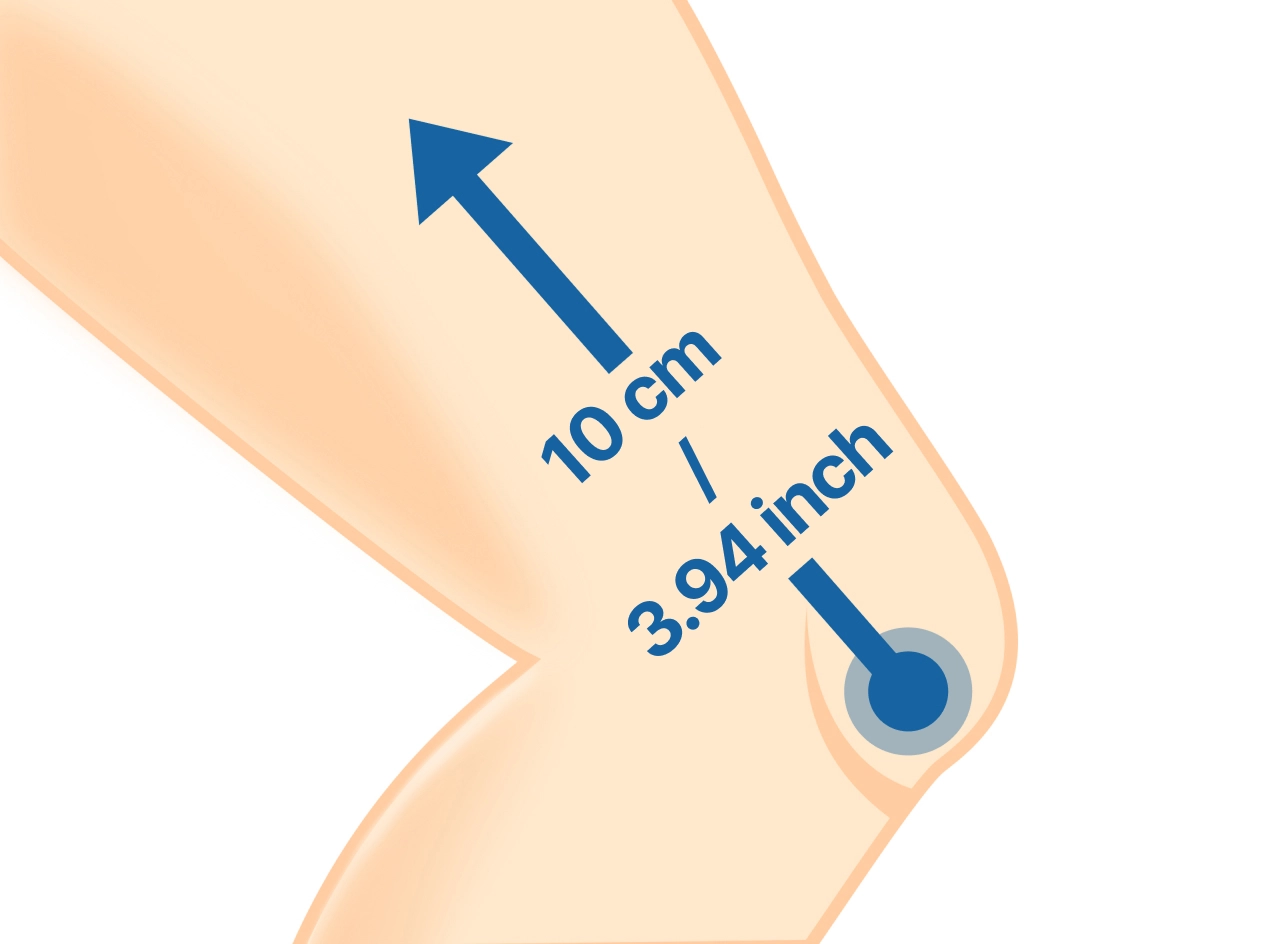 - 2. Înveliți banda de măsurat în jurul celei mai late părți a coapsei, la aproximativ 10cm/3,9" deasupra mijlocului rotulei.
