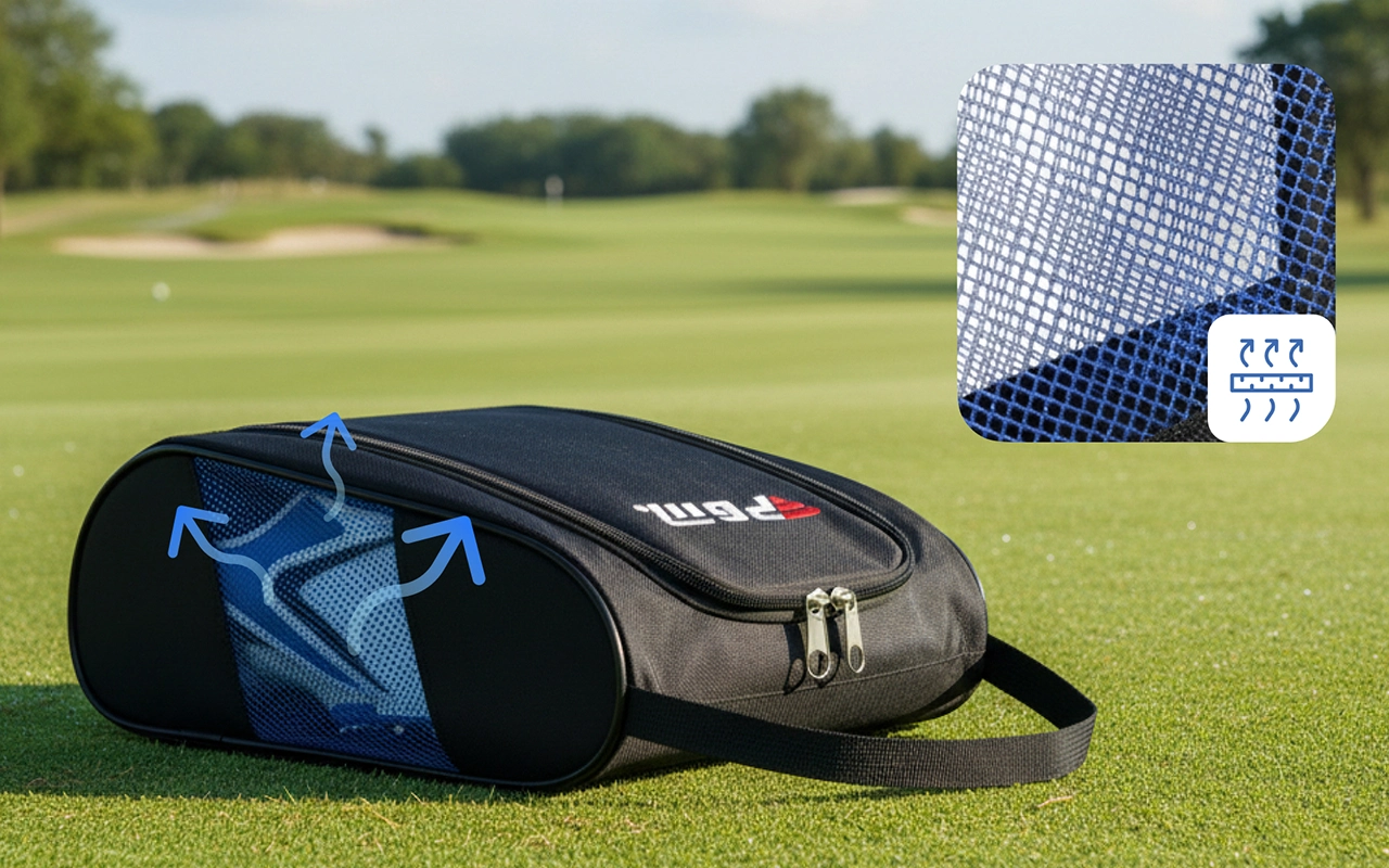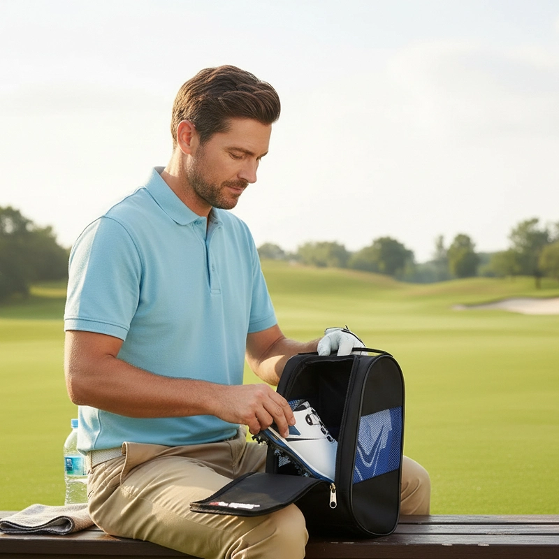 Această geantă pentru pantofi îmi menține pantofii de golf proaspeți și uscați între meciuri. Lateralele din plasă sunt grozave și îmi place cât de ușor este să împachetez totul.