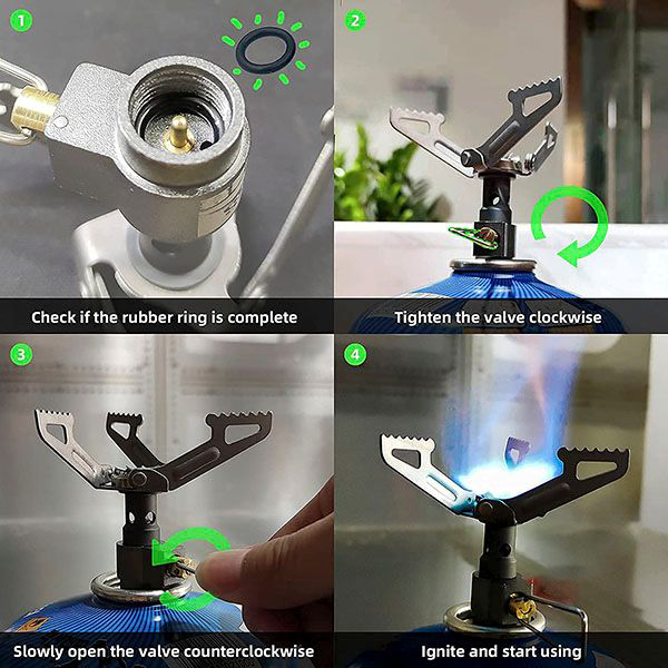 Instalarea aragazului nostru mini este extrem de ușoară, nu necesită unelte speciale și îți va lua doar 10 secunde. Te rugăm să respecți toate precauțiile și să nu permiți copiilor să folosească produsul. Asigură-te că supapa de control este complet închisă înainte de a înșuruba aragazul. Mai întâi, strânge supapa aragazului mini pe canistra de combustibil în sensul acelor de ceasornic cu mâinile. Apoi, desfășoară cele 3 suporturi superioare pentru oale. În final, deschide supapa în sens invers acelor de ceasornic și începe să folosești aragazul mini.