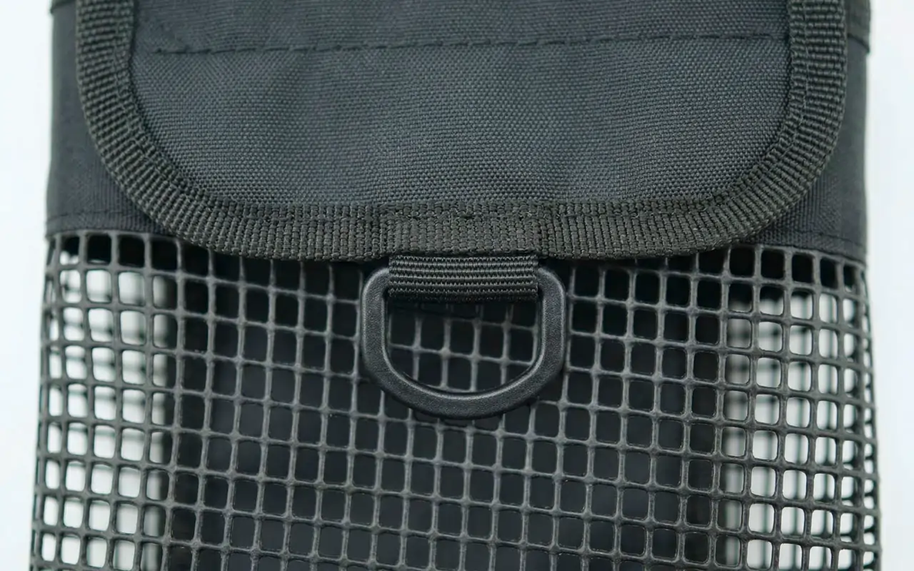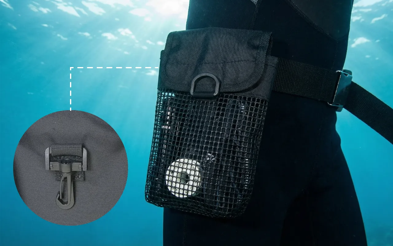 Îl folosesc la centură în timpul acțiunilor de curățare subacvatică. Țin în el coliere de plastic, unelte mici și markere. Părțile din plasă lasă nisipul și apa să iasă ușor, păstrând lucrurile curate.