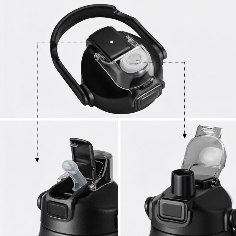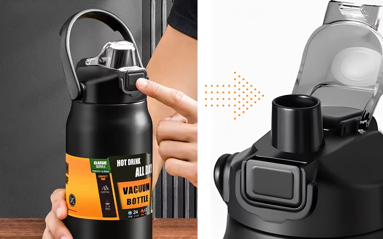 Un singur apăs deschide capacul pentru a bea rapid și ușor. Capacul etanș și blocarea de siguranță previn scurgerile în geantă.