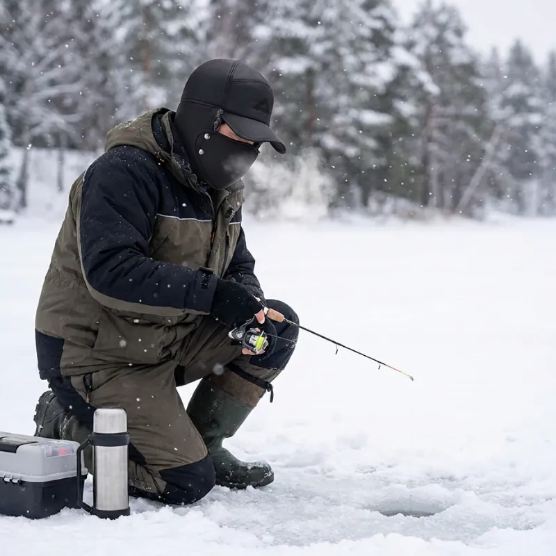 Folosesc căciula la pescuitul la copcă. Clapele pufoase blochează briza de pe lac, iar masca îmi împiedică fața să usture. Se potrivește confortabil peste urechi.