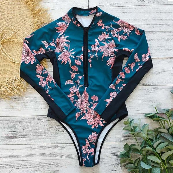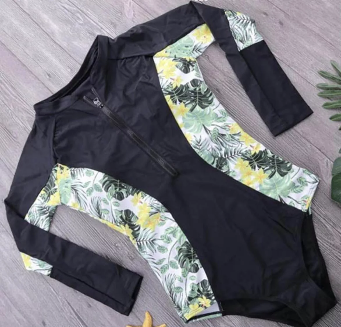 Fii complet pregătită să te bucuri de activitățile acvatice — costumul de baie THREO cu mâneci lungi îți oferă acoperire suplimentară! Te va proteja de arsuri solare, oferindu-ți în același timp o siluetă avantajoasă. Este confecționat dintr-un material ultra-elastic pentru mișcare optimă în apă și este practic pentru acoperire și protecție UV. Costumul nostru are un design elegant de tip întreg în imprimeuri tropicale, fiind o alegere excelentă pentru antrenamente la piscină, înot, surfing sau scufundări.