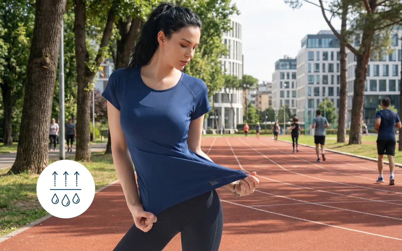 Acest tricou sport mă menține răcoroasă în timpul spinning-ului. Niciun sentiment de lipicios, doar confort. Îmi place că își păstrează forma spălare după spălare.