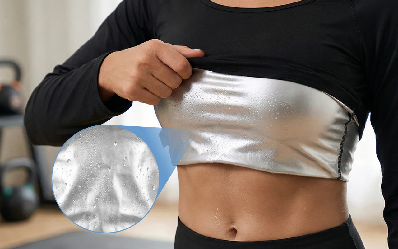 Acest tricou tip saună mă ajută să transpir foarte repede și îmi place cum îmi menține burta netedă sub hanoracul de la sală.